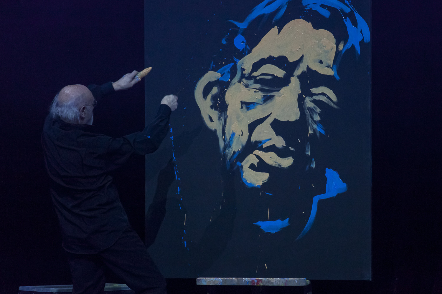 20h45 : Laurent LUYAT annonce la vente aux enchères qui aura lieu en soirée pour les 3 tableaux de Jean-Pierre BLANCHARD avec Steve and Jones (clowns) et Jean Bernard ANGLADE (saxophone)